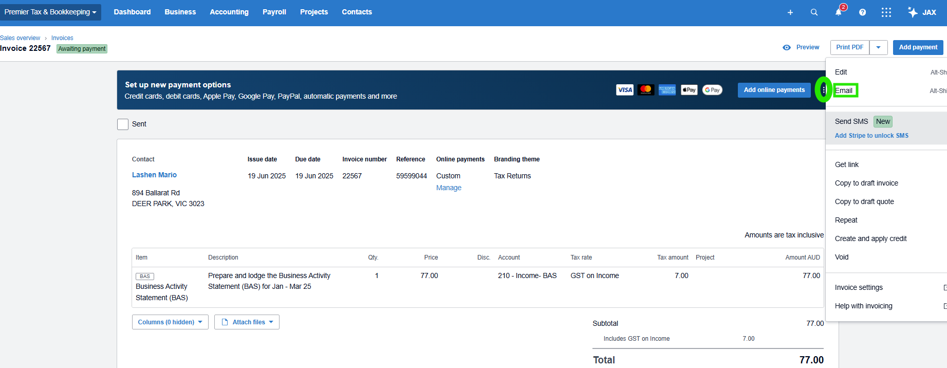 Once you have completed preparing an Income Tax Return, Business Activity Statement (BAS) or other services, you must create and issue an invoice via Xero. The invoice must then be emailed to the client for payment.