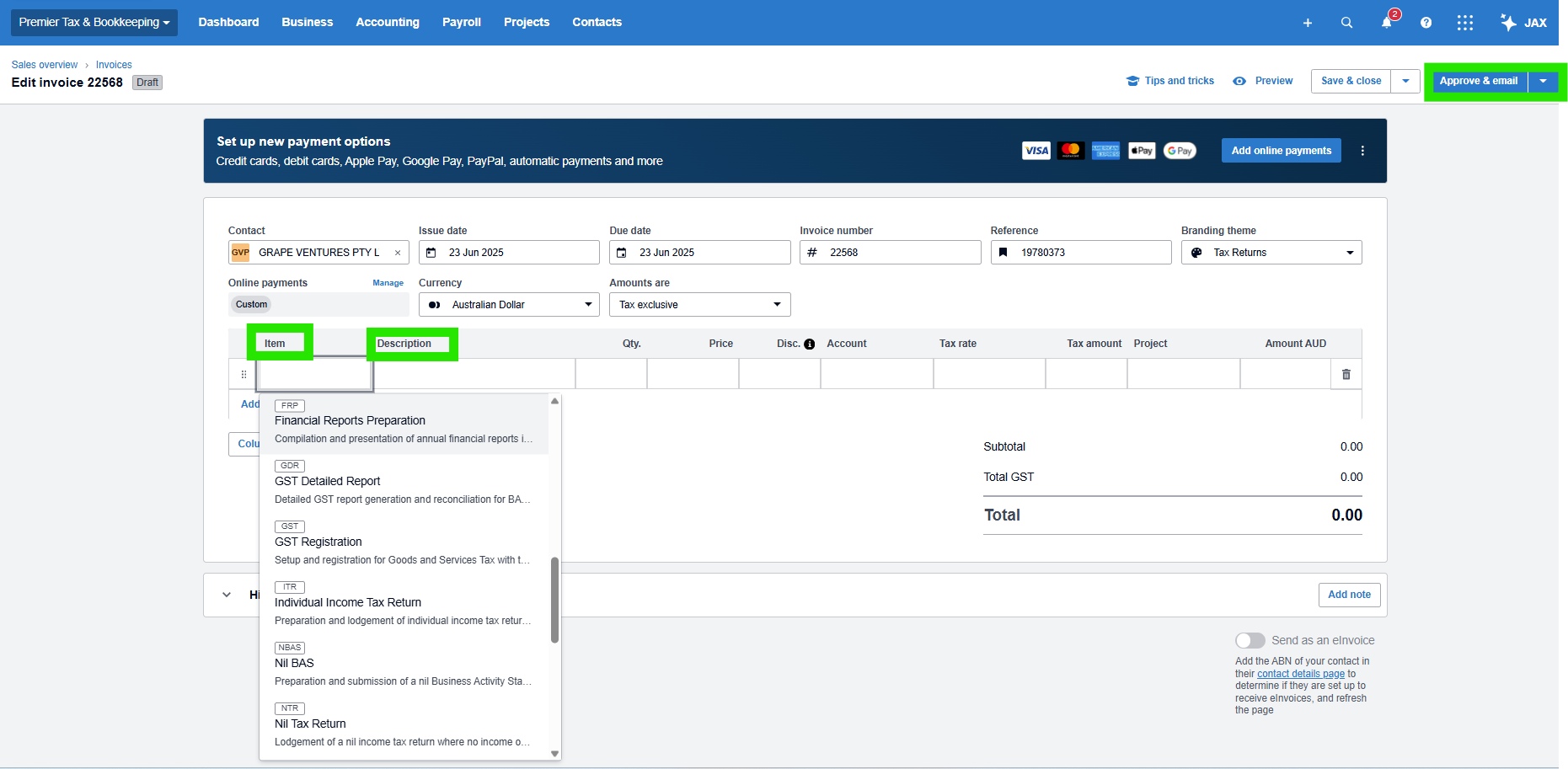 In the ‘Description’ field of the invoice, ensure that you enter the correct tax or BAS period: